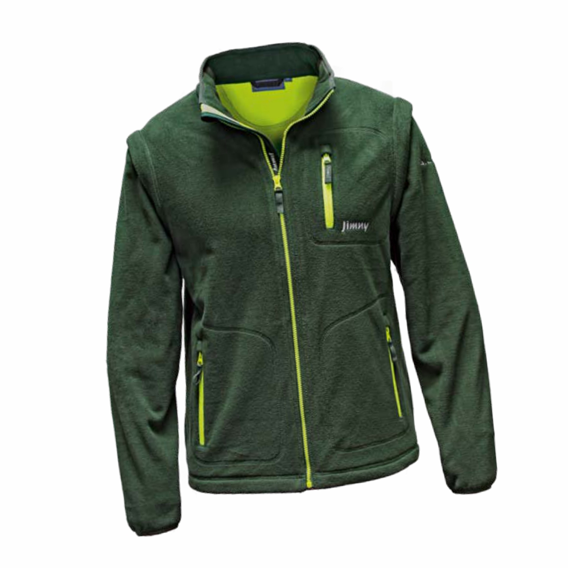 Bonded fleece jacket with detachable sleeves, 3D Jimny logo on rear, 100% polyester.
